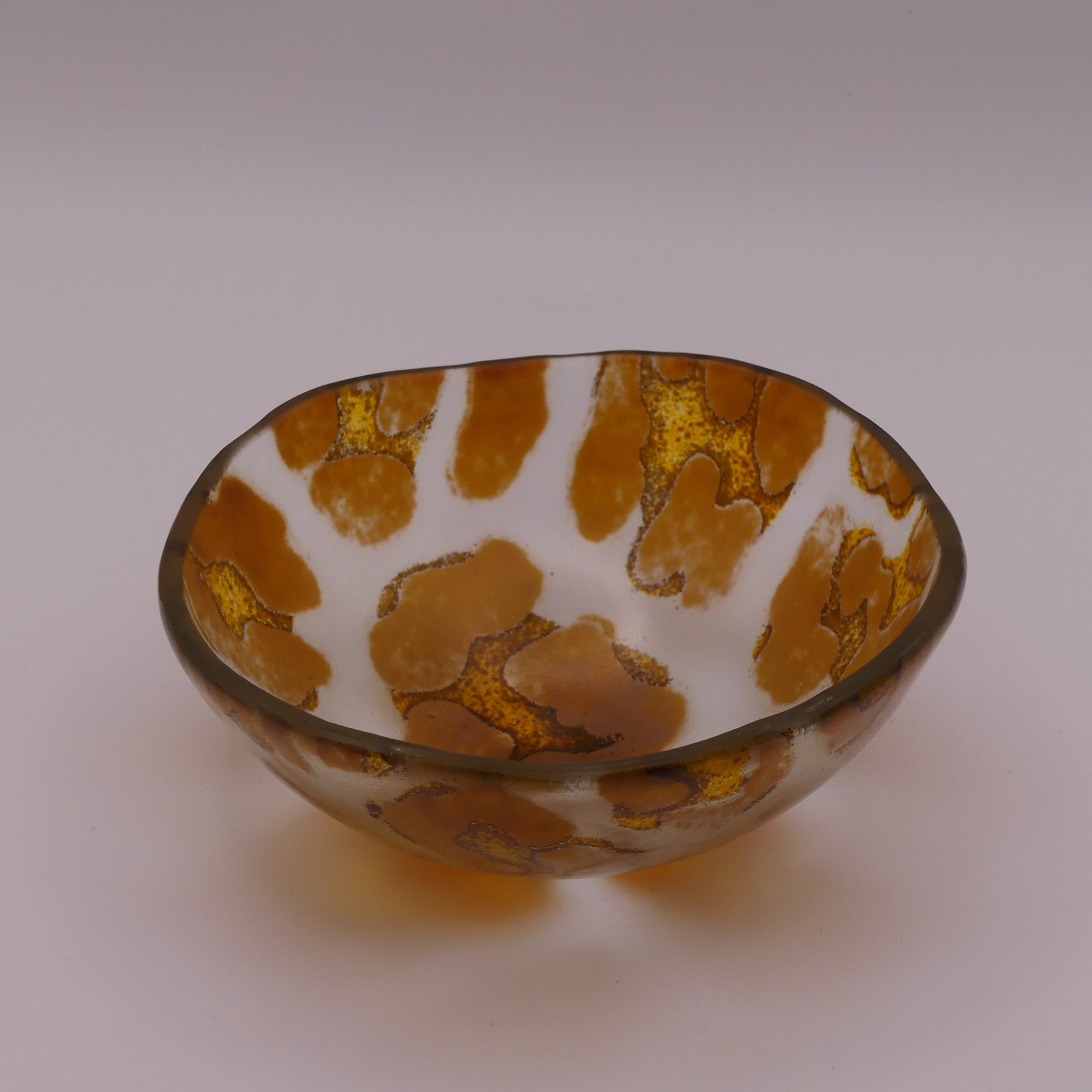Chaque bol est réalisé à partir d’une plaque de verre, puis décoré avec des poudres de verre colorées, appliquées manuellement.