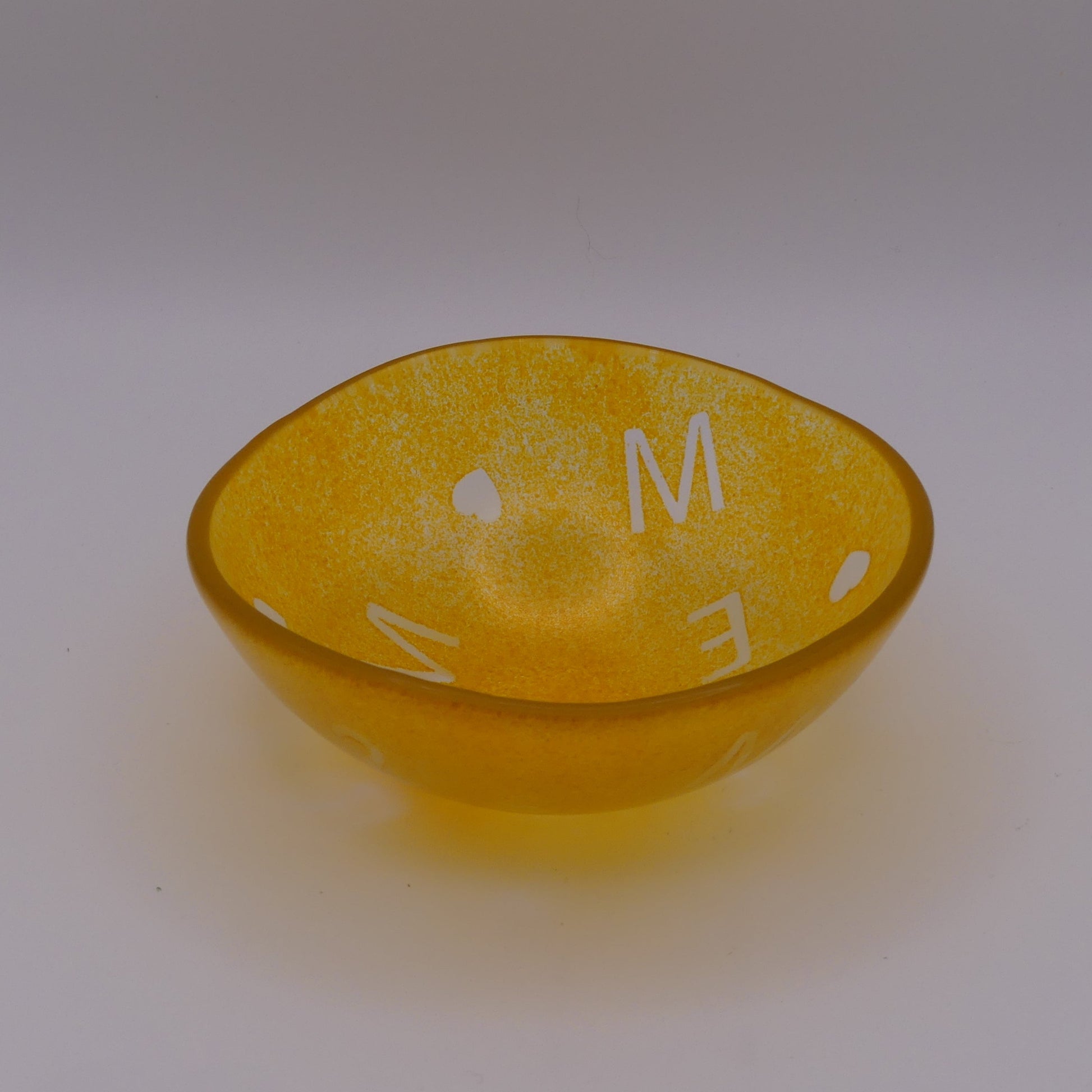 Chaque bol est réalisé à partir d’une plaque de verre, puis décoré avec des poudres de verre colorées, appliquées manuellement.