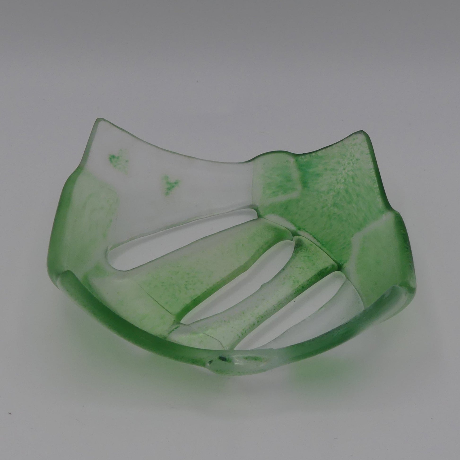 Chaque bougeoir est réalisé à partir de morceaux de plaques de verre, puis décoré avec des poudres de verre colorées, appliquées manuellement.