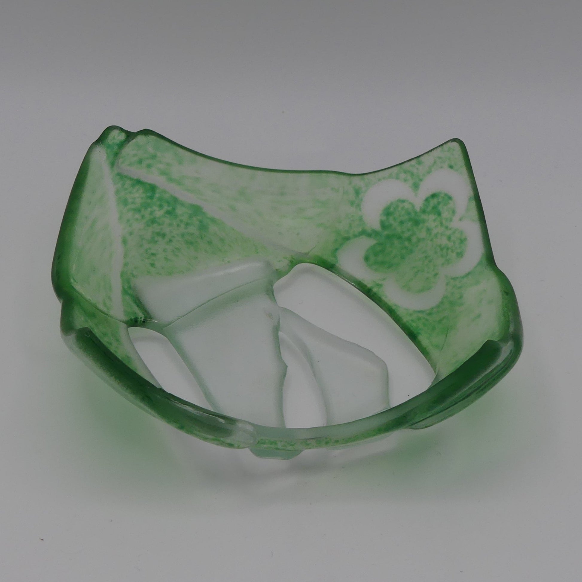 Chaque bougeoir est réalisé à partir de morceaux de plaques de verre, puis décoré avec des poudres de verre colorées, appliquées manuellement.