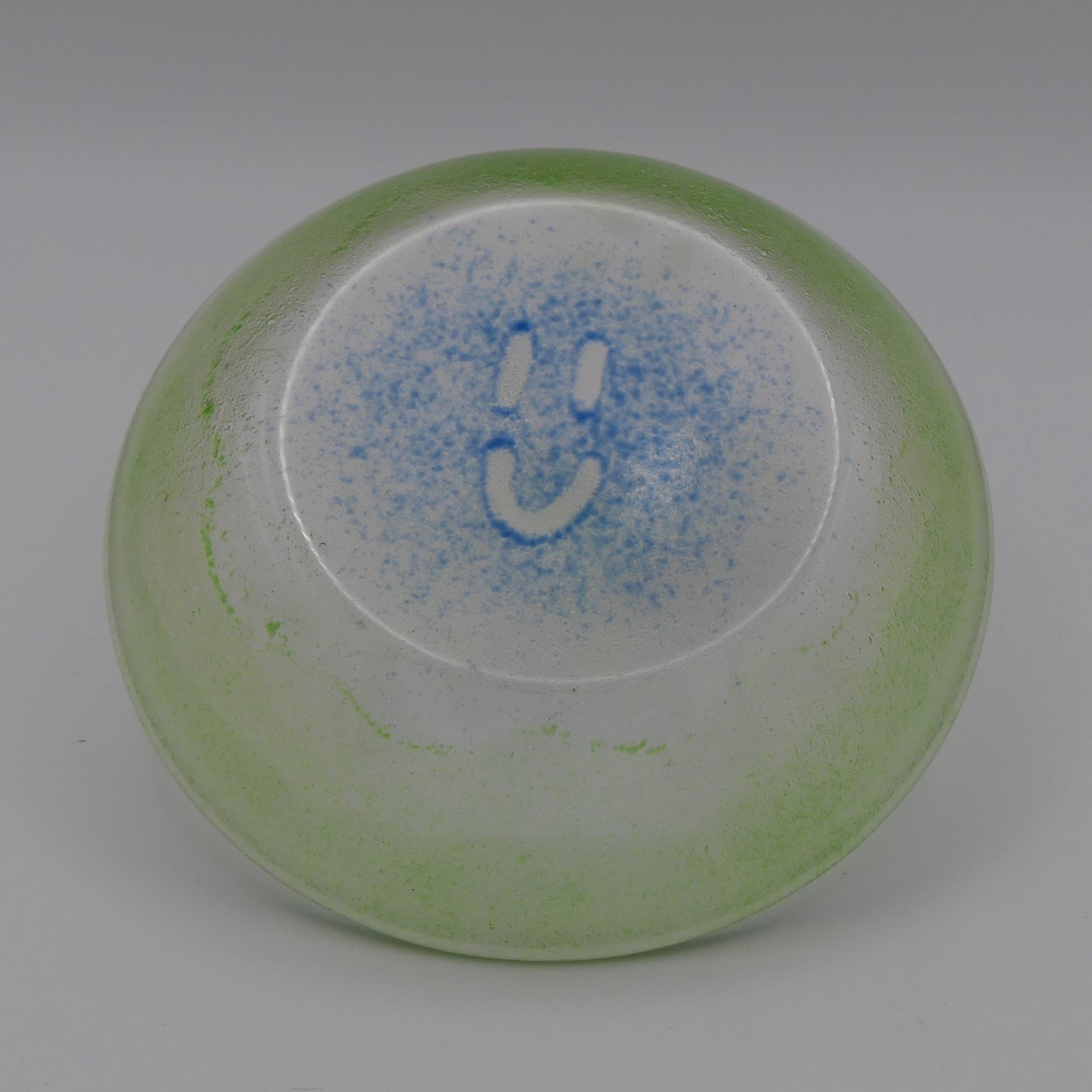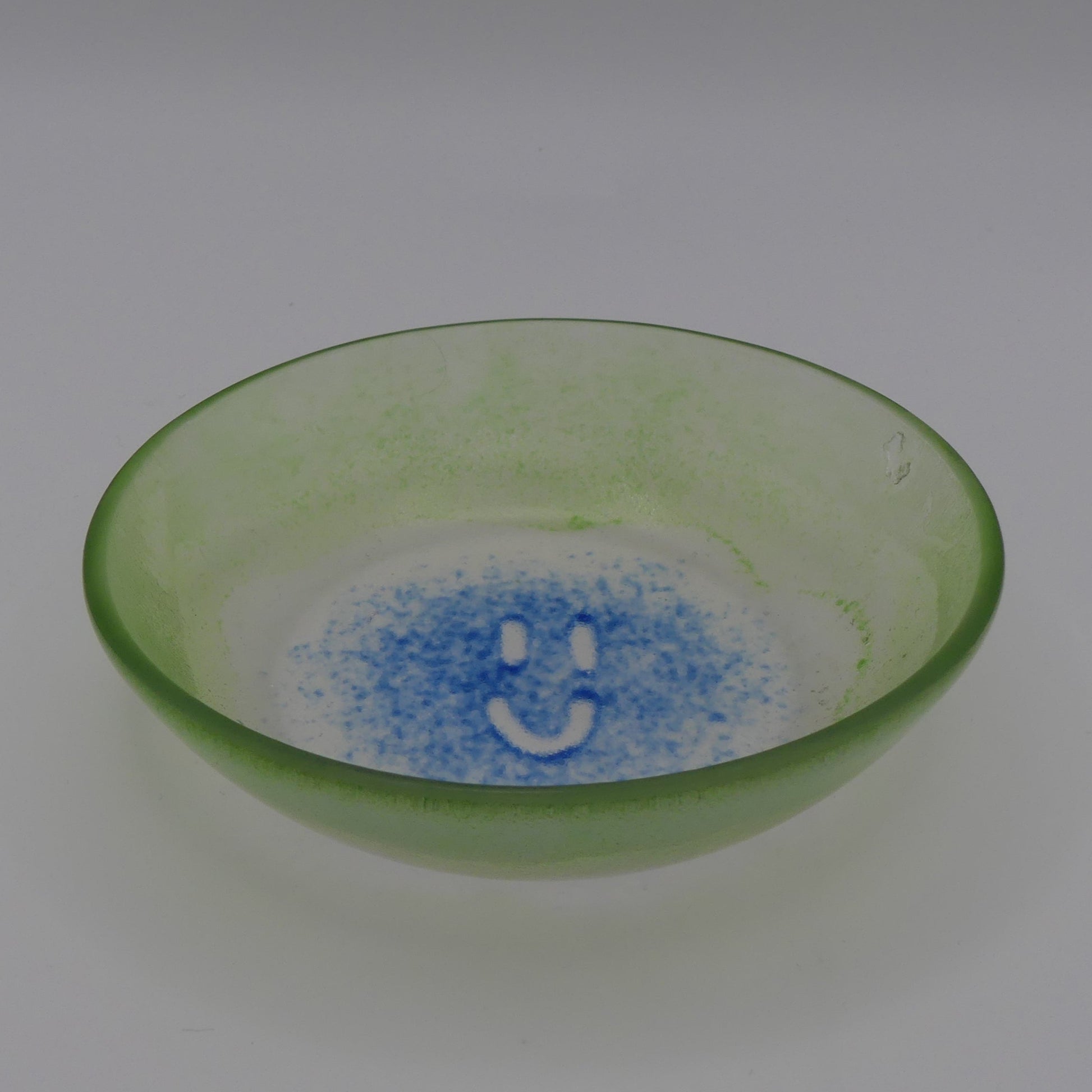 Chaque coupelle est réalisée à partir d’une plaque de verre, puis décorée avec des poudres de verre colorées, appliquées manuellement.