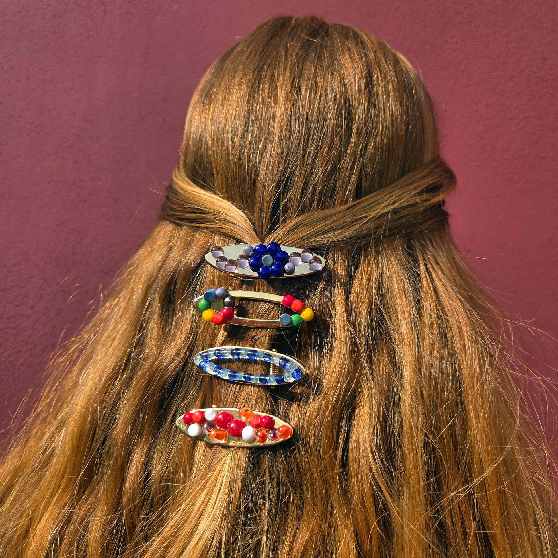 Chaque pince à cheveux est réalisée artisanalement à partir de baguettes de verre colorées, coupées puis travaillées à chaud.
