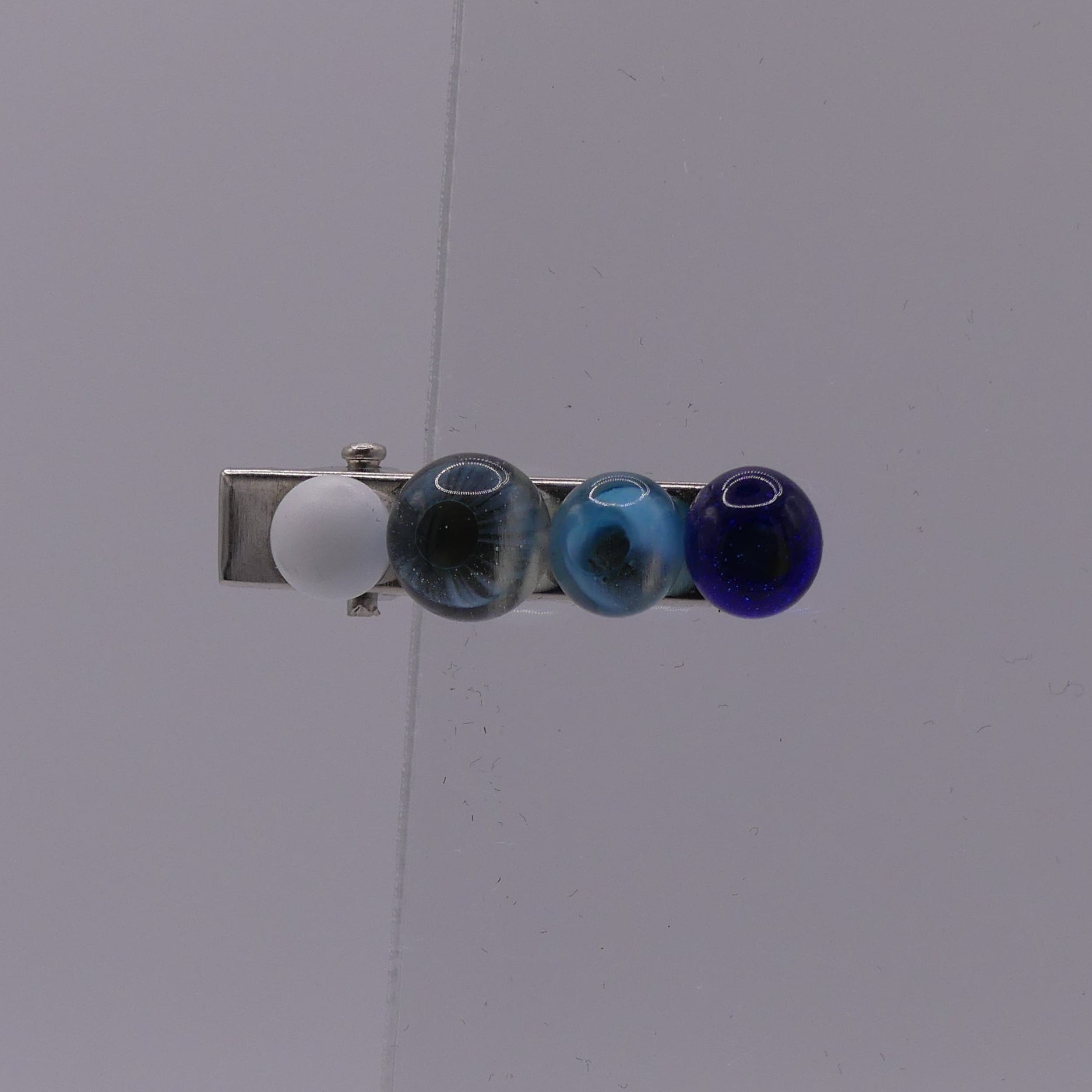 Chaque pince à cheveux est réalisée artisanalement à partir de baguettes de verre colorées, coupées puis travaillées à chaud.
