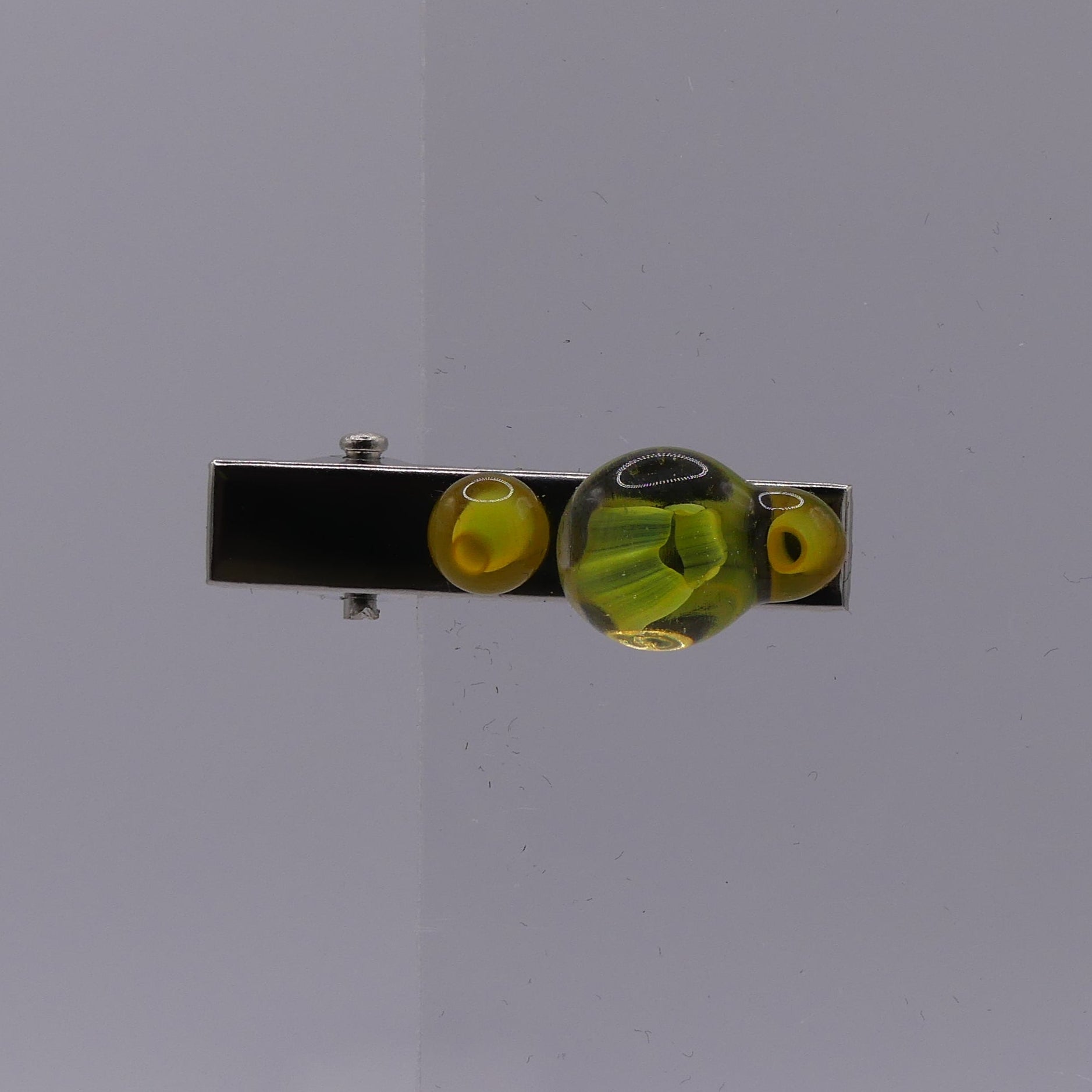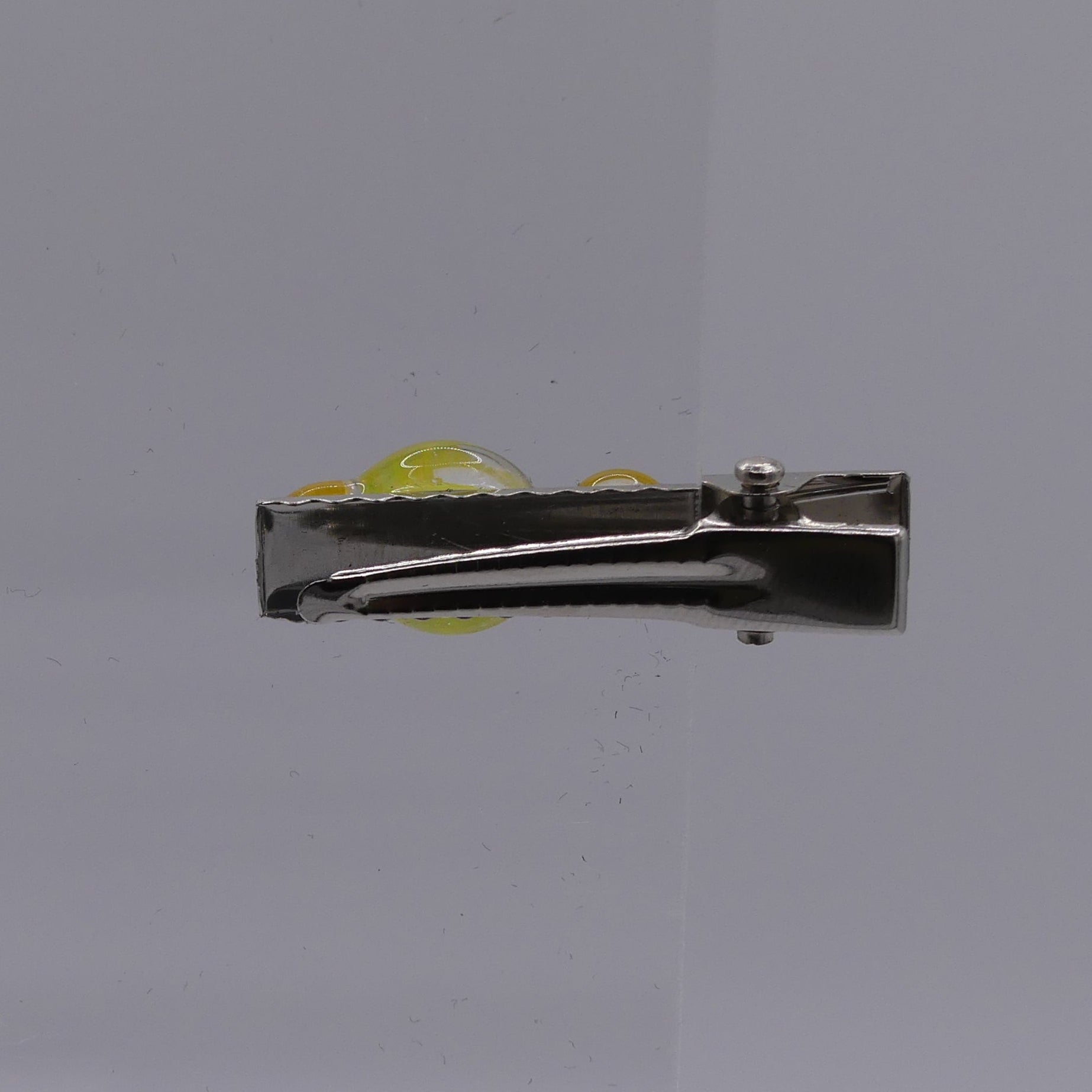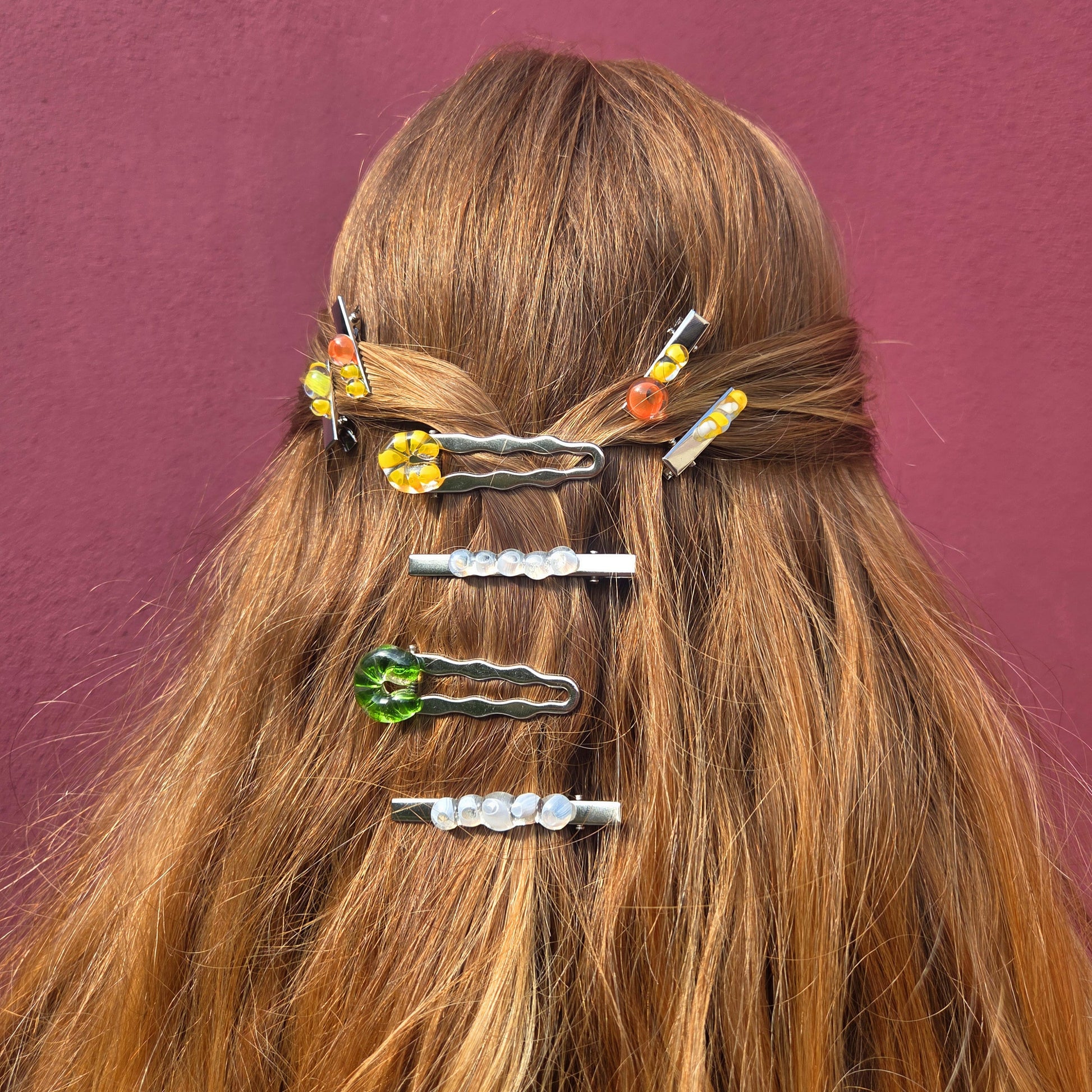Chaque pince à cheveux est réalisée artisanalement à partir de baguettes de verre colorées, coupées puis travaillées à chaud.