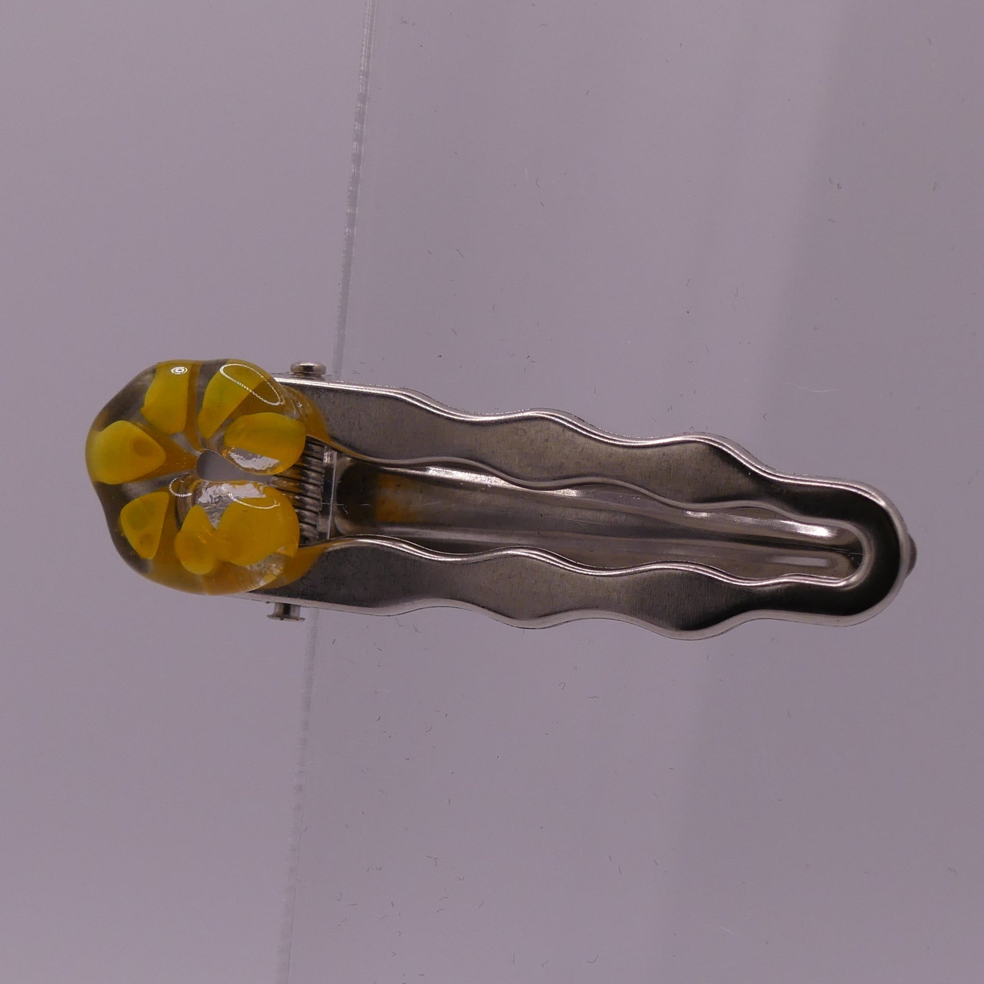 Chaque pince à cheveux est réalisée artisanalement à partir de baguettes de verre colorées, coupées puis travaillées à chaud.